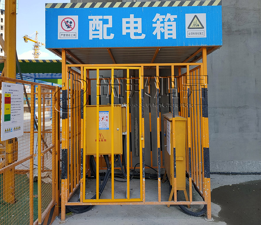 施工现场临时用电配电箱采用全钢结构防护棚,顶部双层防护,配套侧门可上锁,整体拼装方便、使用安全牢靠。