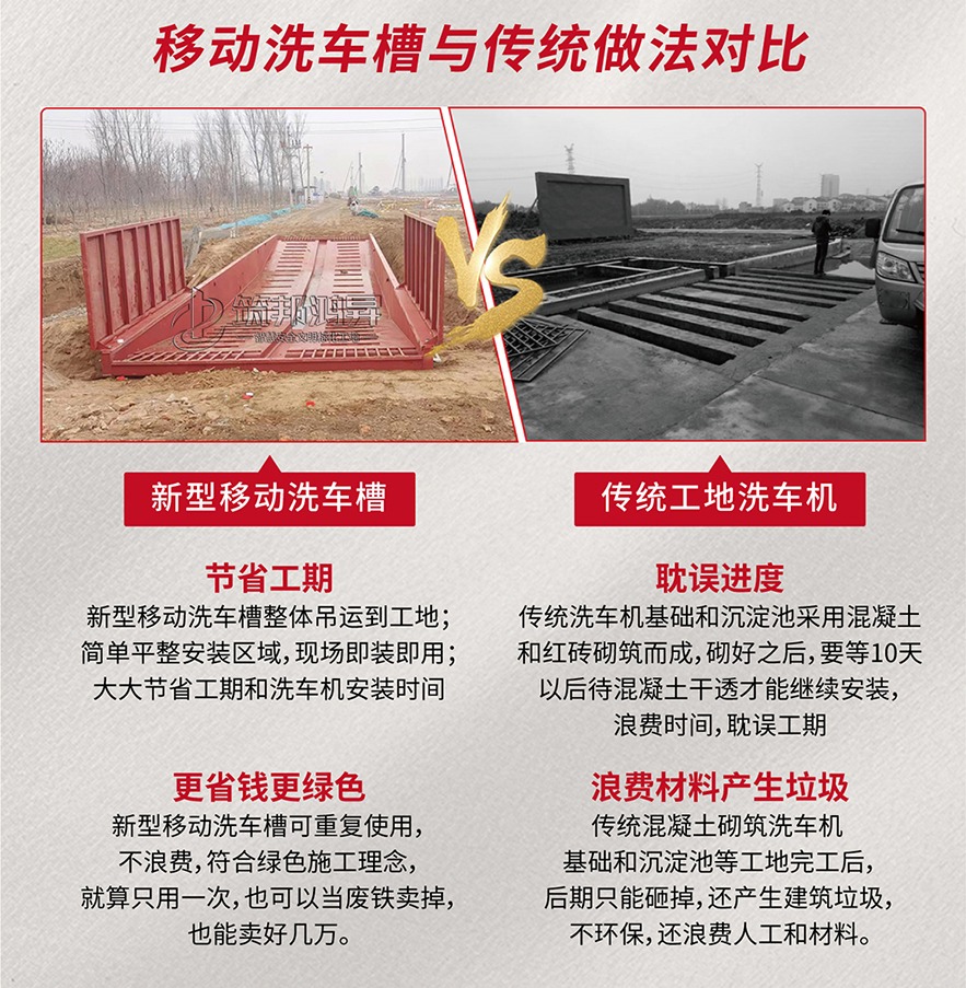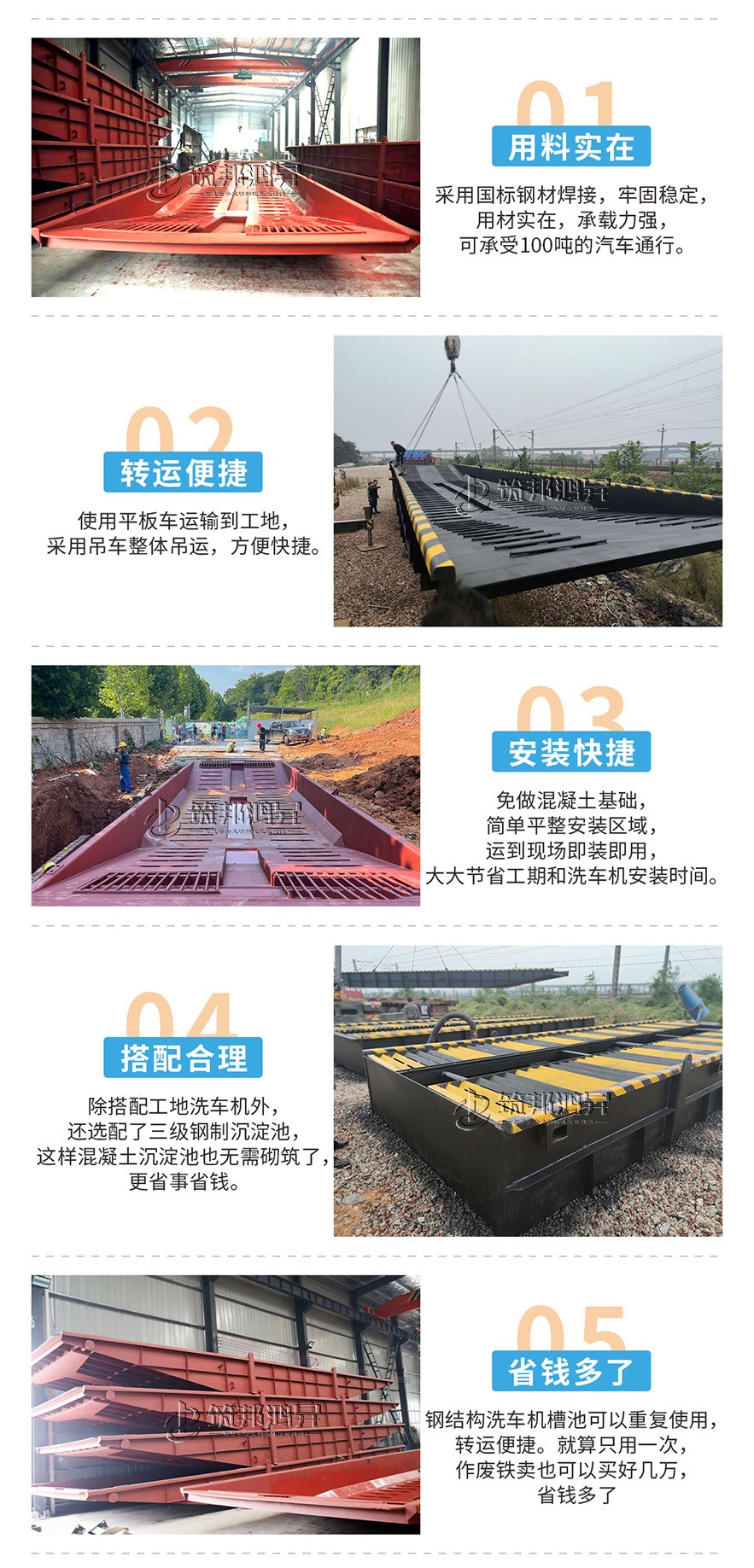 筑邦鸿昇研发的钢结构移动洗车槽池采用整体设计,整体吊运,用料厚实。替代了之前的工地洗车机下面的水泥基础,更加牢固方便,节省了大量的基础砌筑人工和材料,还可以重复使用。如果不需要重复使用;十几吨重的洗车槽做废铁卖,也能卖好几万,大大节省了施工时间和成本。钢结构洗车槽池常规款式有16.6米长和13米长,尺寸可以定制。