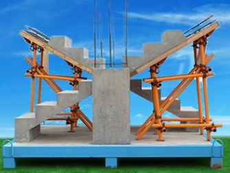 展示工艺:钢筋混凝土、钢筋绑扎、支模体系支撑立杆垂直于地面、混凝土成品、梯板钢筋绑扎、楼梯模板卡槽式支附与加固、梯板1/3处混凝土施工缝留设等工艺。