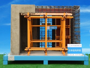 展示工艺:双钢管固定,支撑模剪刀撑,砼施工缝凿毛,双螺母加固,砼成型展示,柱底清扫口,柱模板加固,柱钢筋绑扎,梁底清扫口,梁模板加固,梁钢筋展示,板钢筋绑扎,对拉螺杆加固。