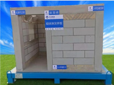 展示工艺:墙体砌筑、包含墙体砌筑、粉灰,根部预先浇筑200高的C20素混凝土墙基,包含混凝土反坎及钢筋支模展示,砌体抹灰,楼面防水,H型立管排水管道展示,烟道反坎,门洞缺口梁,线盒、等电位端子箱预埋等工艺。
