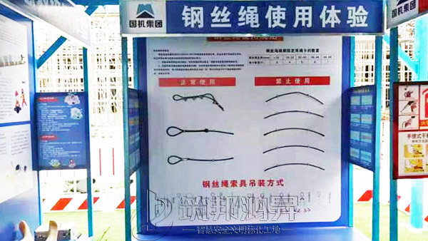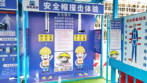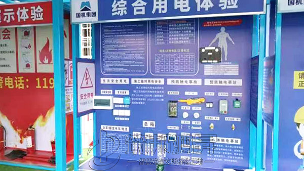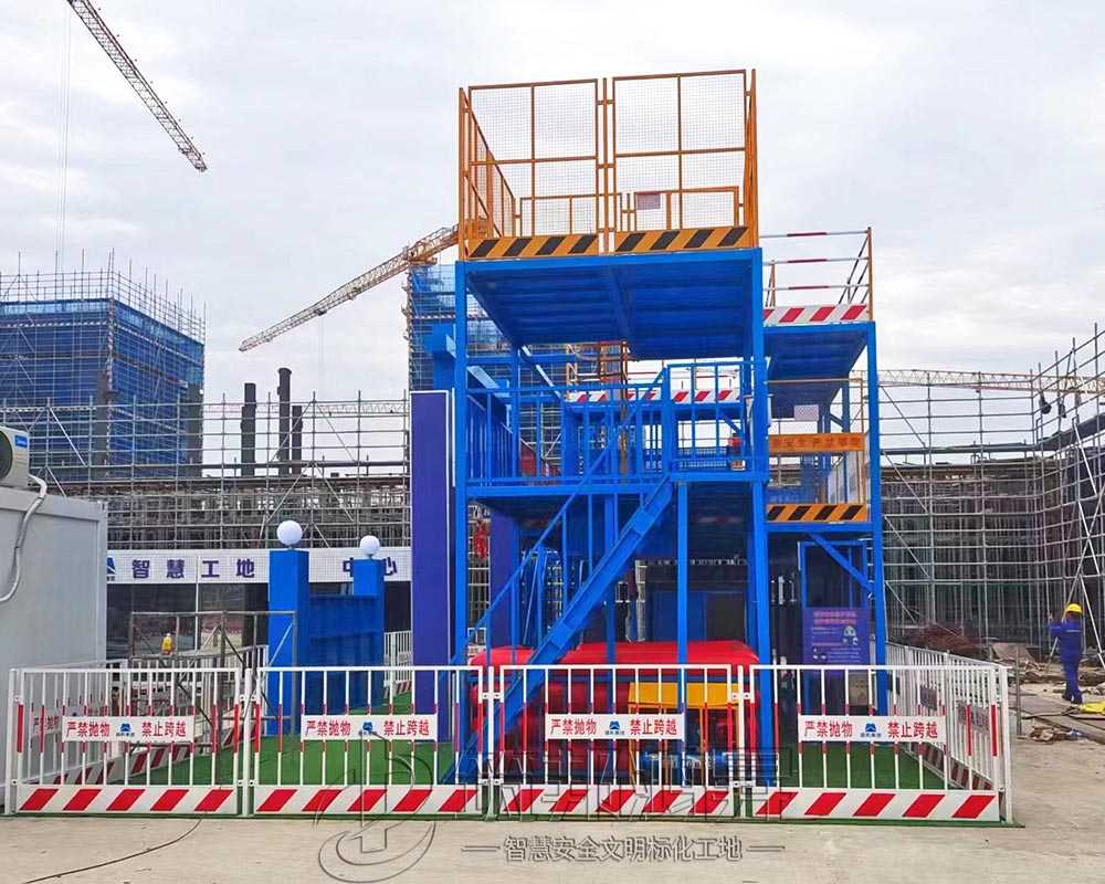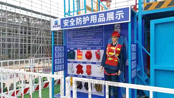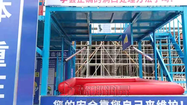 该综合体搭建三层,整体大气美观,各类体验设备组合可定制,第一层设置了安全防护用品体验,安全急救体验,安全着装展示,灭火器演示体验,综合用电体验,安全帽撞击体验,机械伤害体验,安全带体验,洞口坠落体验,第二层设置了平衡木体验,垂直爬梯体验,各类临边护栏展示,施工电梯防护门展示,卸料平台展示。第三层通过爬梯体验上去,设置了工地护栏和塔吊护栏展示。