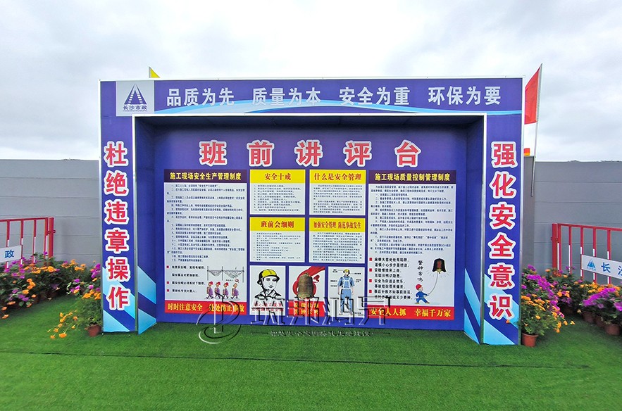 长沙市政集团承建的项目以美观大气的设计、教科书般的安全教育、高标准的市政建设工艺工法,为大家打造了一场建设工程安全生产和质量管理标准化示范观摩会,吸引了众多建筑行业精英前来参观。下面就来看看花园式的文明安全工地的现场。