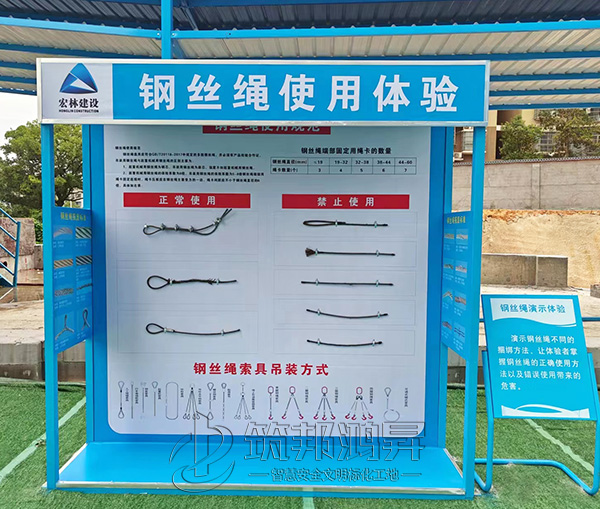 此次合作的工地安全体验馆建设包括了钢丝绳使用体验、综合用电演示体验、灭火器演示体验、平衡木体验、安全防护用品展示体验、安全帽撞击体验等。