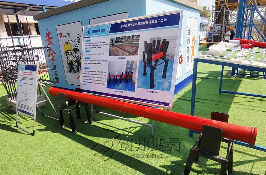 在观摩会现场,还有一个红色圆柱外形的东西吸引了众多观摩人员的注意。湖南教建集团有限公司国欣向荣广场项目项目总指挥长李海平介绍,这是其公司自创的泵送混凝土水平泵管减振消磨施工工法。该工法运用的关键在于利用钢筋、钢板、滚筒、轴承等制作一种减振支架作为混凝土输送水平泵管的支座,以减少在混凝土泵送过程中泵管振动对已绑扎好的钢筋骨架、模板的影响。