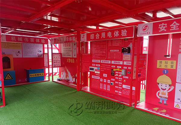 【筑邦鸿昇】安全体验综合体科学组合,占地面积小,美观大气,装在工地就是一个醒目的风景点,大大提升了工地项目的形象。整体共搭建三层,更加大气。一体化多功能无差别体验。走进体验区,第一层设置安全防护用品展示体验、安全带体验、综合用电体验、安全帽撞击体验、灭火器演示体验、机械伤害体验等体验。第二、三层设置洞口坠落体验、重物搬运体验、爬梯体验,以及新式施工电梯防护门套装、各种施工护栏、卸料平台、塔吊护栏等标化设备展示。(除去洞口坠落体验、安全带体验等主要设备,其他体验设备和安全标化产品展示皆可定制,可按照客户实际需求来定制。)